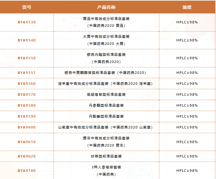 ② 纯度均 ≥98%(HPLC法验证),直接满足 “一部” 中中药饮片、中成药的检测要求;
